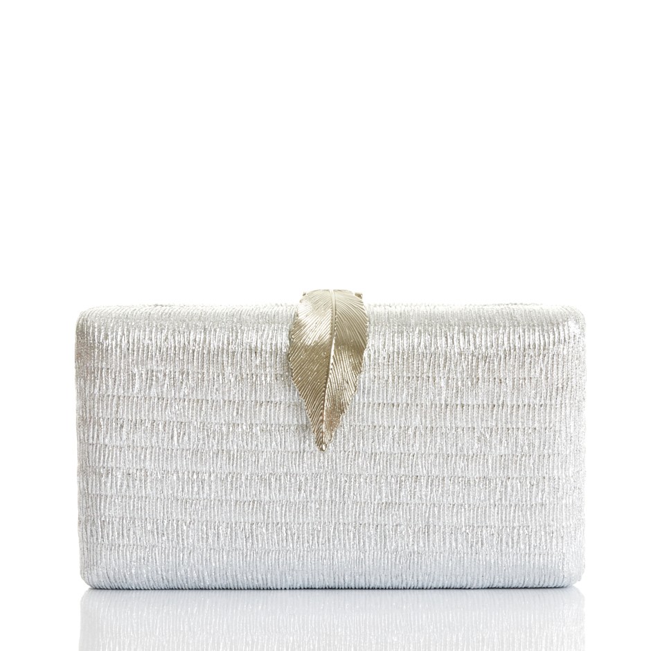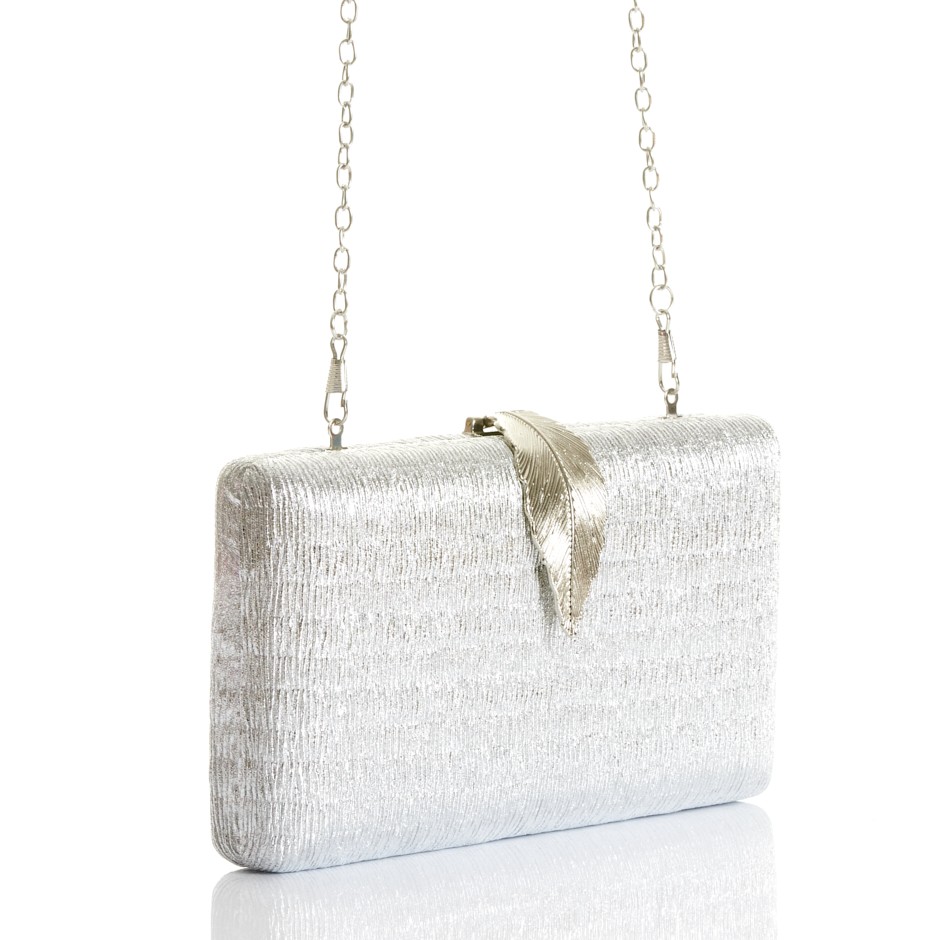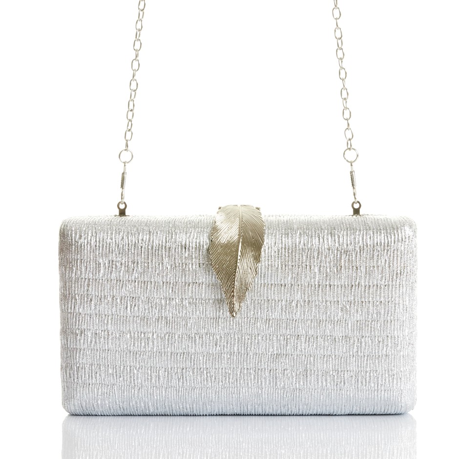 Cartera de fiesta rígido, en forma rectangular y con cierre en forma de hoja. Fabricada en tejido de acabado metalizado. Lleva cadena para colgar.