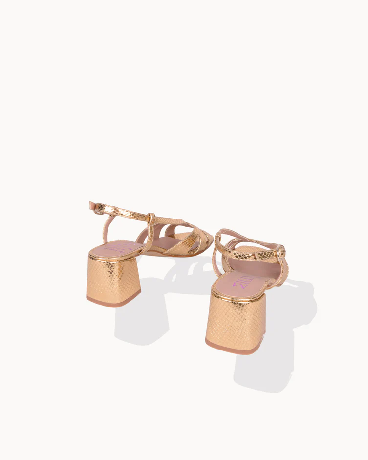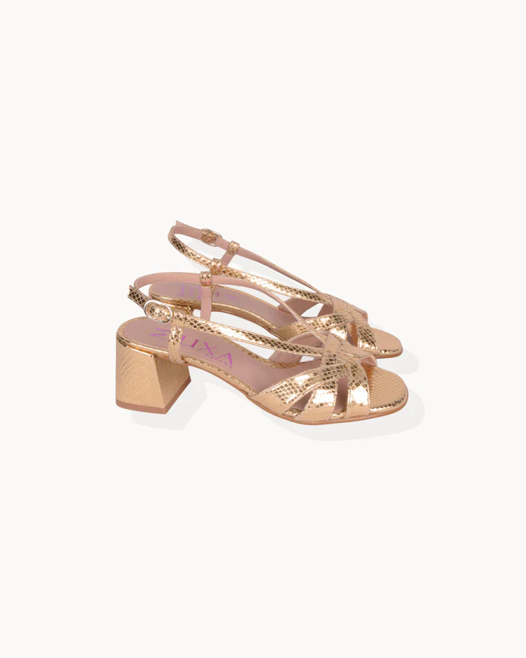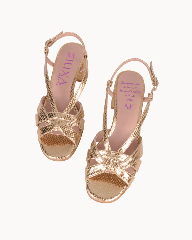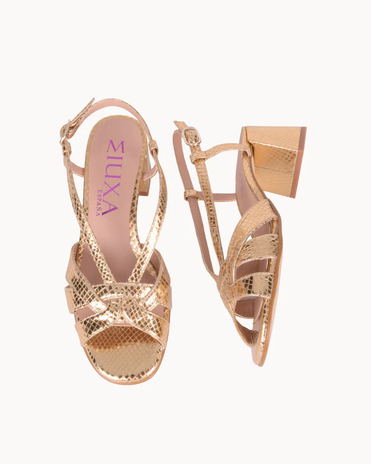 Brilla con cada paso con esta sandalia de tacón bloque en dorado metalizado de MIUXA, marca española de calzado artesanal fabricado en piel de primera calidad.