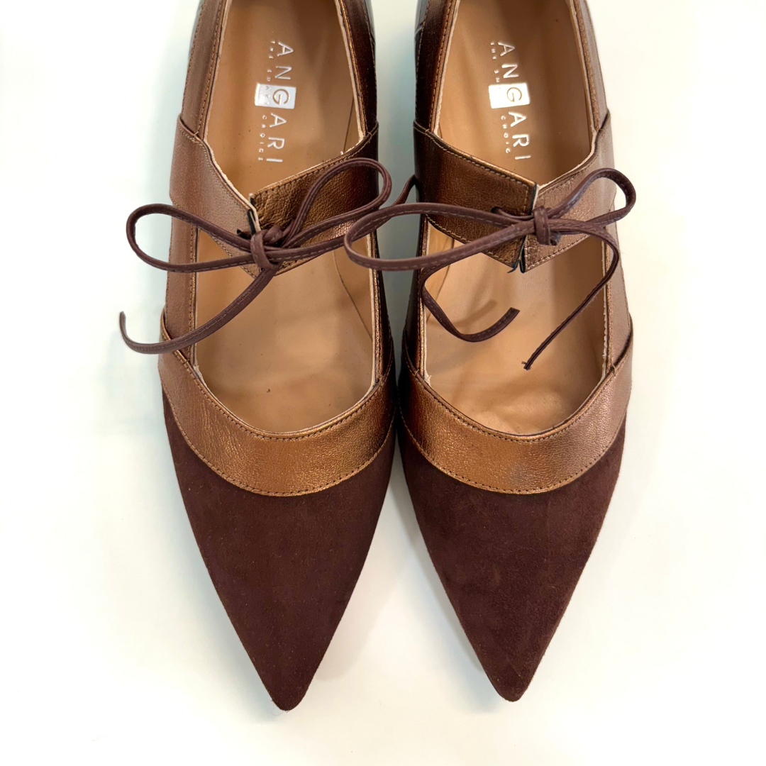 El zapato Coco de Angari, es un modelo exclusivo que solo vas a encontrar en Pisamorena. Ideal para tus looks de oficina y para salir, con la comodidad de un zapato plato. Combina ante marrón chocolate, con piel metalizada en bronce. La parte del talón lleva una piel, también marrón con terminación de coco.